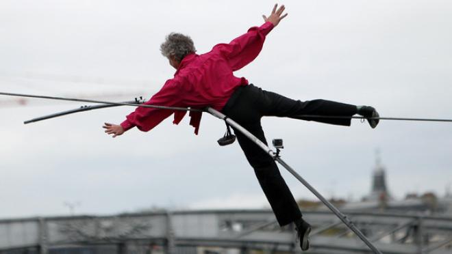 عبر البهلوان الفرنسي دوني جوسلان، نهر السين على حبل مدَّ على ارتفاع 25 متراً فوق النهر في إنجاز يحققه هذا الفنان للمرة الثانية.