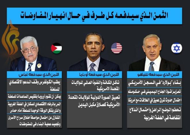 سلطت صحيفة "يديعوت أحرنوت" في عددها الصادر اليوم الثلاثاء الضوء على ما يمكن أن يدفعه كل طرف في المفاوضات الجارية في حال انتهت دون تقدم نتائج ملحوظة، مشيرة إلى أن الإدارة الأمريكية لا تسارع من أجل ترك وساطتها في المفاوضات، على الرغم من تلميحات وزير خارجيتها "جون كيري" نهاية الأسبوع الماضي بذلك.