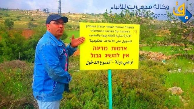 وقال احمد صلاح منسق اللجنة الشعبية لمقاومة الجدار والاستيطان في بيت لحم، "إن جيش الاحتلال اقتحم بلدة الخضر، وتحديدا في محيط مستوطنات "النفي دانيال" و "اليعازر" و "غوش عتصيون" وبدأ بوضع " آرمات" صفراء مكتوب عليها "ممنوع الدخول- أراضي دولة"، ومساحة هذه الاراضي تبلغ 984 دونما".