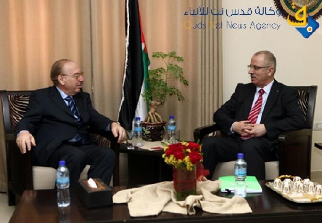 التقى رئيس الوزراء الفلسطيني رامي الحمد الله، في مقر الأمانة العامة لمجلس الوزراء بمدينة رام الله اليوم الثلاثاء، وزير الصناعة والتجارة والتموين الأردني حاتم الحلواني، وأطلعه على الصعوبات التي تواجه تطور ونمو الاقتصاد الفلسطيني بسبب الاحتلال، وخاصة في المناطق المسماة "ج".