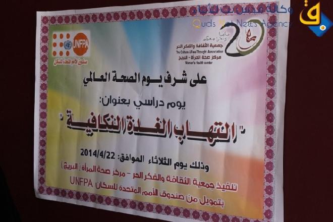 نظم مركز صحة المرأة التابع لجمعية الثقافة والفكر الحر يوما دراسيا حمل عنوان " التهاب الغدة النكافية"،وذلك ضمن حملته التوعوية للحد من انتشار المرض وطرق العلاج والوقاية منه ،على شرف يوم الصحة العالمي ،وبتمويل من صندوق الامم المتحدة للسكان .