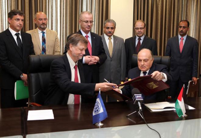 ووقع الاتفاقية: وزير الحكم المحلي، رئيس مجلس إدارة صندوق تطوير وإقراض البلديات سائد الكوني، ووزير المالية شكري بشارة، مع مدير البنك الدولي في فلسطين ستيف يورنسن، بحضور مدير عام صندوق تطوير وإقراض البلديات عبد المغني نوفل.