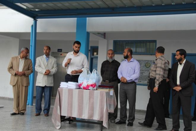 حيث تم تكريم 60 طالب من مختلف مدارس الوكالة بمخيم المغازي وفي ختام الحفل وزعت دار القرآن الكريم والسنة جوائز قيمة على الطلاب، كما وكرّمت مدير المدرسة خالد المصري.