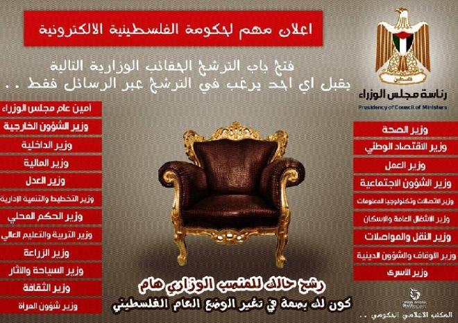 وقد تم فتح باب الترشح لشغل مناصب الوزارات في هذه الحكومة، امام الراغبين من الشبان الفلسطينيين ، قبل اسبوع واحد فقط، وتجرى العملية من خلال ارسال رسالة خاصة الى صفحة (الحكومة الالكترونية ) على (الفيس بوك ) ، تتضمن بروفايل المرشح على موقع التواصل الاجتماعي واسمه والوزارة التي يرغب بالترشح لها، ومن المتوقع ان يقفل باب الترشح في غضون الاسبوعين القادمين، حسب ما اعلنت الناشطة الشبابية واحد القائمين على الصفحة مريم حامد .