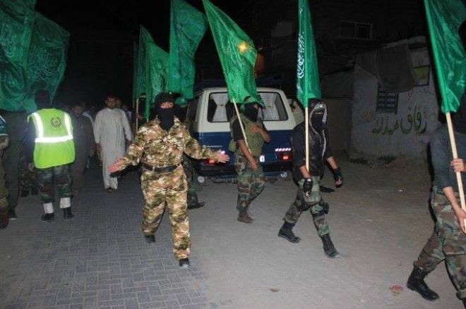 ورفع الملثمون صور شهداء وحدة التصنيع في كتائب القسام مشمش وثابت، وسط هتافات ممجدة لدور الشهيدين في الإعداد والتصنيع وداعمة للمقاومة.
