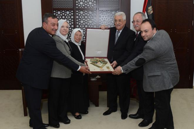 وتسلم الوسام من أبو مازن، في مقر الرئاسة بمدينة رام الله، مساء الاثنين، زوجة الشهيد وأولاده، وعدد من أفراد عائلته.