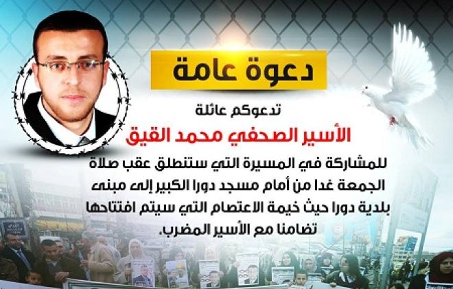 دعت عائلة الصحفي الأسير المضرب عن الطعام داخل سجون الاحتلال الاسرائيلي محمد القيق، جماهير مدينة الخليل المحتلة وقراها المجاورة، للمشاركة الواسعة في المسيرة التضامنية مع نجلها، والتي ستنطلق ظهر الجمعة.