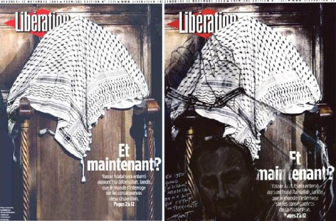 والقطعة الفنية موضع شكوى السفارة الاسرائيلية هي صفحة اولى لصحيفة ليبيراسيون تعود لعام 2004 تعلن مواراة الزعيم الفلسطيني الراحل ياسر عرفات التي رمز اليها بكوفية مع عنوان "والآن؟".