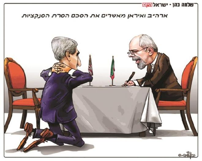 ويكثر في إسرائيل هذه الأيام الحديث عن مقاربتين متناقضتين في التعاطي مع هذا المنحى. واحد يطالب باتخاذ مواقف متشددة وهجومية ضد كل مظاهر مناهضة إسرائيل ومشروعها الاستيطاني، وهو موقف يتخذه كل قادة اليمين المتشدد. وآخر يدعو إلى المبادرة إلى بلورة مبادرة سياسية تعيد وضع إسرائيل على خريطة التسوية مع الفلسطينيين ما يسهل على أوروبا ابداء تساهل ما. وليس صدفة أن رسامي الكاريكاتير في كبريات الصحف الإســــرائيلية لاحظوا هذه المقاربات وعرضوها في رسوماتهم. وهكذا فإن صحيــــفة "إسرائيل اليوم" المقرّبة من رئيس الحكومة الإسرائيلية بنيامين نتنياهو عرضـــت رسما للتوقيع على إزالة العقوبات عن إيران ظهر فيه وزير الخارجية الإيراني في موضع السيد يوقع على الاتفــــاق فيما وزير الخارجية الأميركي جون كيري في موضع الأسير الذي كان عليه عدد من جنود مشاة البحرية الأميركية أسرتهم إيران مؤخرا. أمــا صحيفة "هآرتس" فعرضت رســـما لنتنياهو ووزير جيشه موشي يعـــلون مع عدد من الطيارين الإســـرائيليين في قاعدة بحرية وهو يطالبهم بالوصول إلى ستوكهولم واختراق حاجز الصوت فوقها.