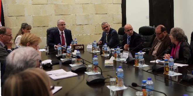 استقبل رئيس الوزراء رامي الحمد الله، اليوم الثلاثاء بمكتبه في رام الله، بعثة العلاقات مع فلسطين في البرلمان الأوروبي برئاسة مارتينا اندرسون، بحضور ممثل الاتحاد الأوروبي لدى فلسطين رالف طراف، لبحث الإجراءات الدبلوماسية التي ينفذها الاتحاد الأوروبي لدعم حل الدولتين.