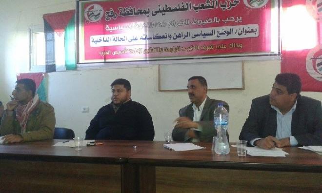 جاء ذلك خلال الندوة السياسية التي نظمها حزب الشعب الفلسطيني في محافظة رفح بحضور حشد من الشخصيات الوطنية وممثلي القوى السياسية والفعاليات الشعبية والمهتمين بالشأن السياسي والمجتمعي، وبمشاركة عضو المكتب السياسي نافذ غنيم، والعضو القيادي في حركة فتح جلال شيخ العيد، والقيادي في حركة حماس عز الدين كساب .