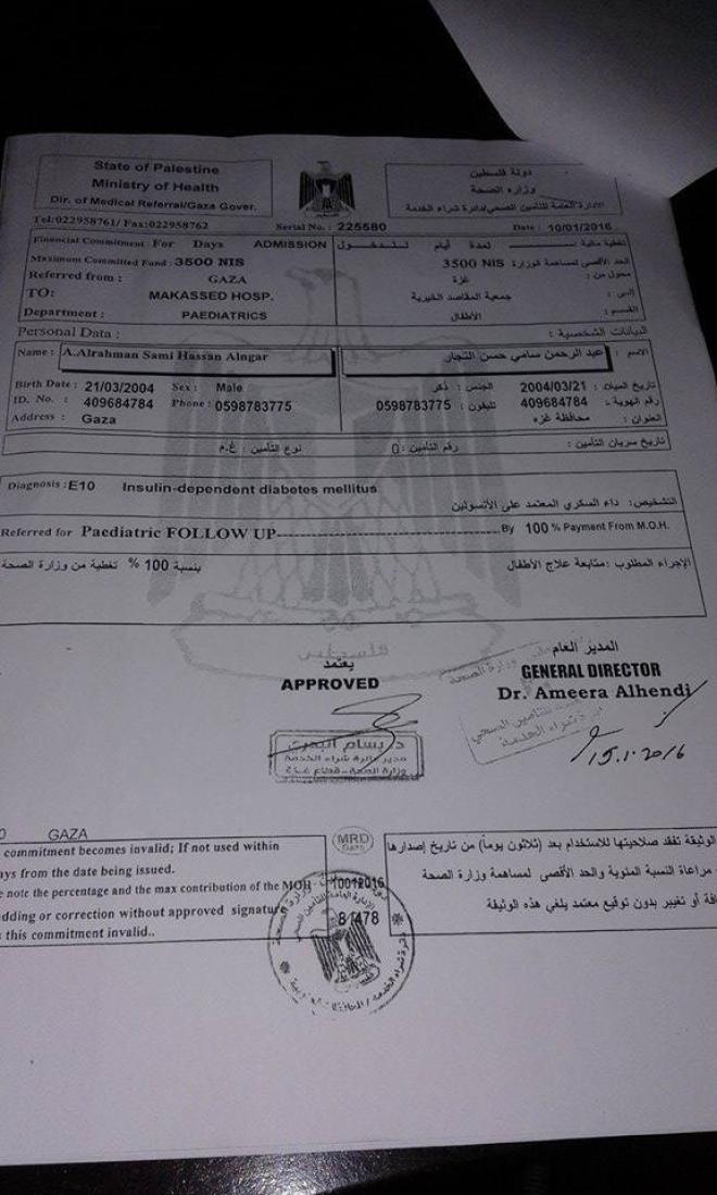 وأوضح المواطن النجار أنه حصل على تحويلة مرضية من دائرة العلاج بالخارج في مدينة غزة لابنه عبدالرحمن سامي النجار المصاب بمرض السكر ,وغادر للعلاج أكثر من مرة في مستشفيات الداخل الفلسطيني المحتل وتحديدا مستشفى "أوخلوف".
