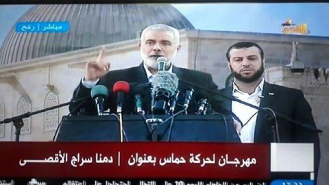 وفي كلمة خلال مهرجان نظمته حركة حماس بمدينة رفح جنوب قطاع غزة جدد هنية التأكيد على التبني المطلق لانتفاضة القدس التي تشهدها الاراضي الفلسطينية وقال "إنها أعظم تحول استراتيجي في السنوات الأخيرة وهي مستمرة حتى تعود الأرض حرة".