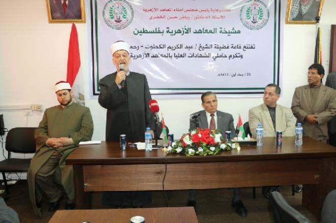 أقامت مشيخة المعاهد الأزهرية بفلسطين تحت رعاية الأستاذ الدكتور/ رياض الخضري رئيس مجلس أمناء المعاهد الأزهرية احتفالاً تكريمياً بمناسبة افتتاح قاعة فضيلة الشيخ/ عبد الكريم الكحلوت – رحمه الله – وتكريم تسعة عشر أستاذاً من أساتذة المعاهد الازهرية الحاصلين على شهادتي الماجستير والدكتوراه، وذلك صباح اليوم الخميس، وحضر الحفل رئيس وأعضاء مجلس أمناء المعاهد الأزهرية والعشرات من العلماء وأساتذة الجامعات وأسرة الشيخ الكحلوت والمتبرعون الكرام بالإضافة إلى العاملين في المعاهد الأزهرية .