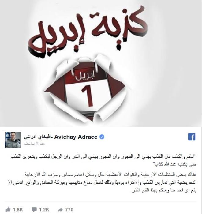 بعد دقائق من تصريحات لأبي عبيدة المتحدث الرسمي لكتائب القسام ونشر صور للجنود الإسرائيليين المحتجزين لديها يوم الجمعة 1 أبريل/ نسيان 2016، دوّن المتحدث باسم الجيش الإسرائيلي أفخاي أدرعي على حسابه الرسمي على فيسبوك حديثاً نبوياً حول الكذب، ملمحاً بأن ما أعلنته حماس يعد كذبة أبريل.