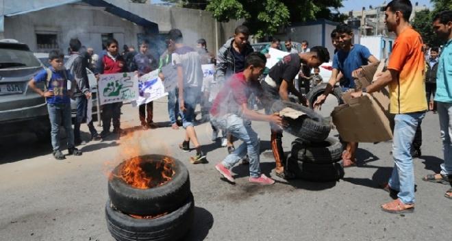 أشعل شبان فلسطينيون، اليوم الأربعاء، النار أمام مقر المندوب السامي التابع للأمم المتحدة بمدينة غزة، احتجاجاً على قرار وقف توريد الأسمنت إلى القطاع وعدم استلامهم للإيجارات منذ عدة أشهر بحجة التوقيع على مبالغ مالية لإعادة إعمار منازلهم.