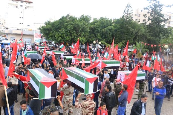 على شرف يوم الأسير الفلسطيني، وبمناسبة مرور 40 يوماً على استشهاد الأسير المحرر القيادي في الجبهة الشعبية عمر النايف، وتلبيةً لنداء ذوي الشهداء المحتجزة جثامين أبنائهم من قبل الاحتلال نظمت الجبهة الشعبية لتحرير فلسطين صباح اليوم الثلاثاء مسيرة جماهيرية حاشدة شارك بها الآلاف انطلقت من ميدان " السرايا" إلى ميدان الجندي المجهول بمدينة غزة، بمشاركة واسعة من قيادات وكوادر وأعضاء وأصدقاء الجبهة، وحشد من الجماهير، وقيادات العمل الوطني والمجتمعي، تقدمهم مقاتلين ملثمين يحملون نعوش رمزية تحمل أسماء الشهداء المحتجزة جثامينهم من قبل الاحتلال، بالإضافة إلى نعش للشهيد النايف.