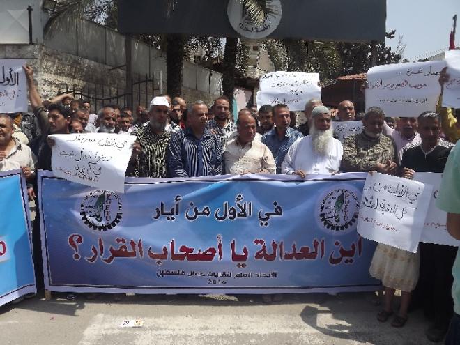 جاء ذلك خلال اعتصام عمالي نظمته نقابات العمال بمناسبة "يوم العمال العالمي الأول من آيار" أمام مجلس الوزراء بمدينة غزة، شارك فيه رؤساء النقابات العمالية وحشد من العمال المتعطلين عن العمل، رفعوا خلاله لافتات ورددوا هتافات تطالب بفك الحصار وفتح المعابر، وتشغيل العمال وإنصافهم وعدم تجاهل مطالبهم، متسائلين عن غياب الدور الفلسطيني الرسمي من معاناتهم؟.