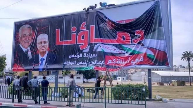 وتضع حماس وسط مفترق السرايا في غزة، يافطة ضخمة تحمل صورة الرئيس الفلسطيني محمود عباس، ورئيس وزرائه رامي الحمد الله، إلى جانب جثث أطفال متفحمة وكتب عليها "دماؤنا في أعناقكم".