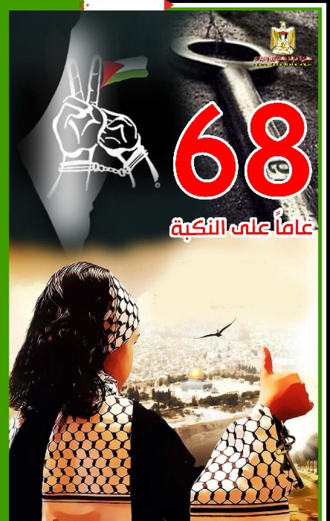 "رغم النكبة فإن الطريق إلى القدس أقرب إلينا من حبل الوريد مادامت الإرادة والإيمان،ولهذا يجب أن تيقى النكبة حيةً في قلوبنا وضمائرنا"، تحت هذا الشعار، ستحيي سفارة دولة فلسطين في الجزائر الذكرى68 للنكبة الفلسطينية، في المكتبة الوطنية بالحامة يوم الأحد 15.05.2016 على الساعة الثانية بعد الزوال،وسيكون ذلك برعاية من وزير الثقافة الجزائري عز الدين ميهوبي،