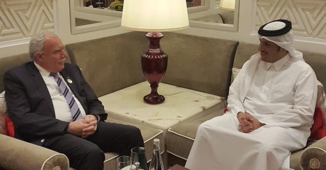 ألتقى وزير الخارجية الفلسطيني رياض المالكي مع نظيره القطري محمد بن عبد الرحمن آل ثان، في العاصمة الدوحة على هامش أعمال الدورة السابعة لمنتدى التعاون العربي الصيني، الذي اختتم مساء الخميس، واحتلت القضية الفلسطينية من أهمية بالغة على جدول الاجتماع الوزاري فيه.