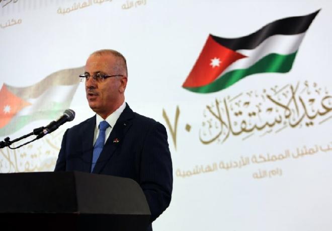 واضاف رئيس الوزراء: "إنه لشرف كبير لي أن أشارككم اليوم إحيائكم للذكرى السبعين لاستقلال المملكة الأردنية الهاشمية والذكرى المئوية لإنطلاق الثورة العربية الكبرى، وأن أرفع، نيابة عن فخامة الرئيس الأخ محمود عباس وأبناء شعبنا الفلسطيني، إلى صاحب الجلالة الملك عبدالله الثاني والشعب الأردني الشقيق والعزيز، أسمى آيات التهنئة والتبريك، سائلين الله عز وجل أن يعيد هذه المناسبة الوطنية العزيزة، والأردن يواصل مسيرة التطور والتقدم والنمو".