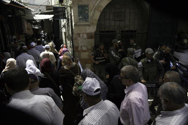 اعاقت قوات الاحتلال الإسرائيلي خروج سيدة مصابة من باحات المسجد الأقصى المبارك، أصيبت نتيجة التدافع، اليوم الجمعة.