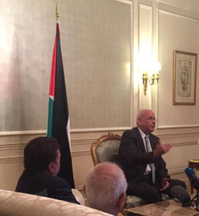 قال أمين سر اللجنة التنفيذية لمنظمة التحرير الفلسطينية صائب عريقات، إن الرئيس محمود عباس(أبو مازن) أكد خلال لقائه وزيري الخارجية الفرنسي جان مارك ايرولت والأميركي جون كيري، كلا على حدة، اليوم السبت في العاصمة الفرنسية باريس، دعمه الكامل للمبادرة الفرنسية.