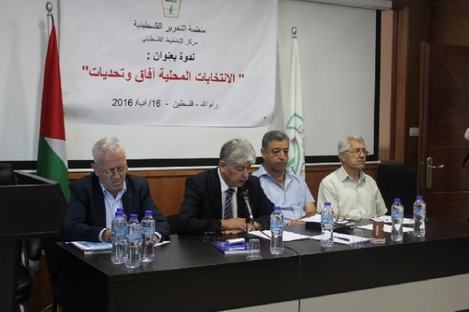 نظم مركز التخطيط الفلسطيني اليوم الثلاثاء ندوة سياسية بعنوان " الانتخابات المحلية آفاق وتحديات"، وذلك في قاعة منظمة التحرير بمدينة رام الله ، بحضور اعضاء من اللجنة التنفيذية ،وباحثين ومختصين، وممثلي الاحزاب السياسية ومنظمات المجتمع المدني .