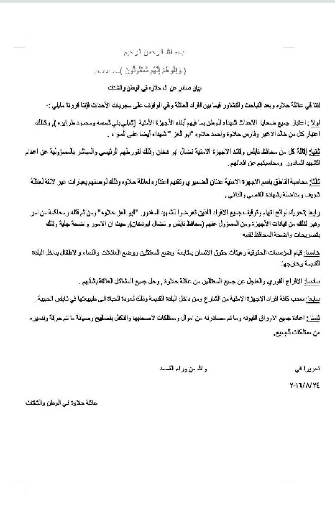 نشرت عائلة حلاوة في نابلس، بيان عبر مواقع التواصل الاجتماعي، يتضمن عدة مطالب من السلطة الفلسطينية، وذلك في أعقاب مقتل ابنها أحمد حلاة (أبو العز) بعد اعتقاله من قبل قوى الامن في سجن "الجنيد" .