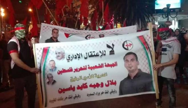 نظم المئات من أهالي بلدة عصيرة الشمالية (مسقط رأس الأسير بلال كايد) شمال مدينة نابلس بالضفة الغربية الليلة، مسيرة كبيرة في الشوارع الرئيسة في البلدة؛ احتفالا بـ"انتصاره على السجان الاسرائيلي" وفك إضرابه الذي تجاوز 70 يوما ، وانتهت في خيمة التضامن معه.