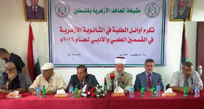 أقامت مشيخة المعاهد الأزهرية بفلسطين صباح اليوم الأربعاء احتفالاً تكريمياً لأوائل الطلبة في الثانوية الأزهرية في القسمين العلمي والأدبي، وحضر الحفل رئيس وأعضاء مجلس أمناء المعاهد الأزهرية وعدد من العلماء وأولياء أمور الطلاب والطالبات بالإضافة إلى العاملين في المعاهد الأزهرية.