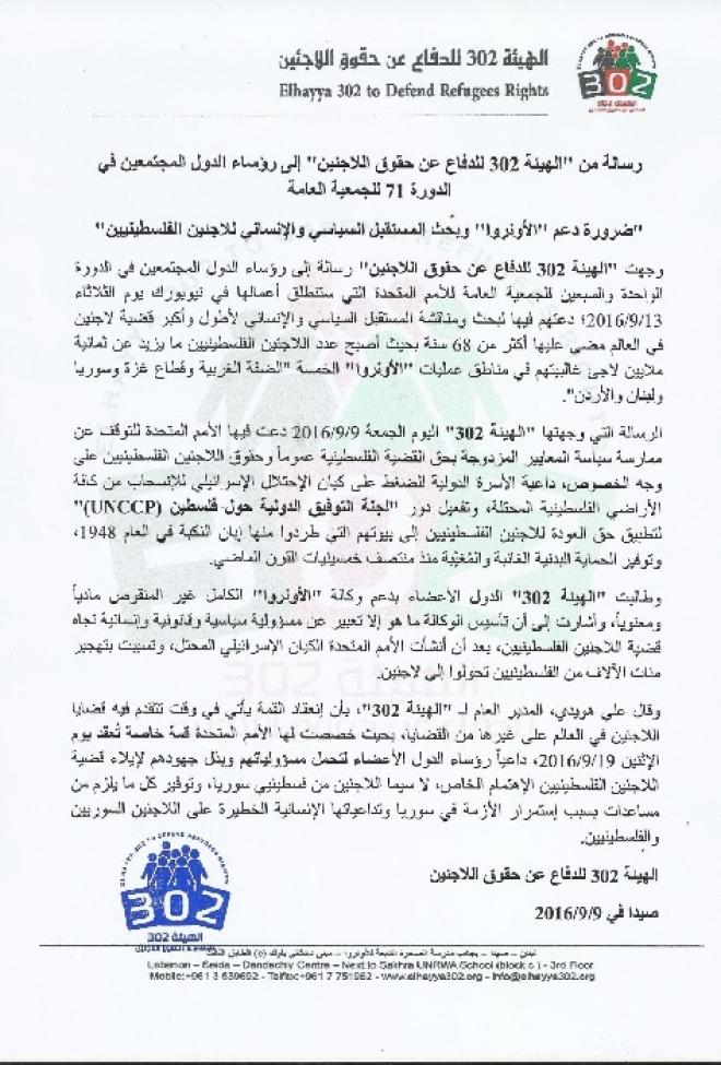 وجهت "الهيئة 302 للدفاع عن حقوق اللاجئين" رسالة إلى رؤساء الدول المجتمعين في الدورة الواحدة والسبعين للجمعية العامة للأمم المتحدة التي ستنطلق أعمالها في نيويورك يوم الثلاثاء 13/9/2016؛ دعتهم فيها لبحث ومناقشة المستقبل السياسي والإنساني لأطول وأكبر قضية لاجئين في العالم مضى عليها أكثر من 68 سنة بحيث" أصبح عدد اللاجئين الفلسطينيين ما يزيد عن ثمانية ملايين لاجئ غالبيتهم في مناطق عمليات "الأونروا" الخمسة "الضفة الغربية وقطاع غزة وسوريا ولبنان والأردن".