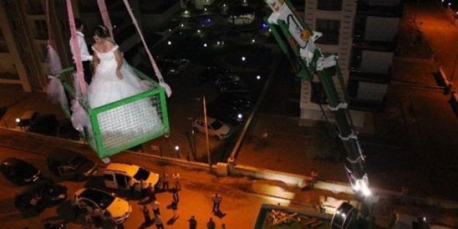 ففي حادثة طريفة وقعت في مدينة أيدن على سواحل بحر إيجة، غرب تركيا، فوجئ العروسان مراد وإيكن شانجون بوجود رافعة كبيرة أمام العمارة التي اشتريا إحدى شققها، تستعد لنقلهما إليها جواً بعد تعطل مصاعد المبنى.