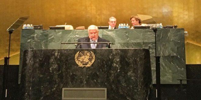 قال وزير الخارجية السوري وليد المعلم إن :"بلاده التي تواجه "الإرهابيين المرتزقة" على أرضها اليوم واجهت ولا تزال إرهاباً من نوع آخر وهو إرهاب إسرائيل التي ما زالت تحتل جزءا غاليا من أرضنا في الجولان السوري منذ الرابع من حزيران عام 1967 والتي ما زال شعبنا العربي السوري هناك يعاني من ممارساتها القمعية والعدوانية لا بل إن تلك الممارسات تجاوزت الجولان المحتل لتنال من أمن وحياة السوريين في المناطق الجنوبية من سورية من خلال تدخل إسرائيل العسكري المباشر لدعم التنظيمات الإرهابية في تلك المنطقة وتأمين مختلف أشكال الدعم لها."