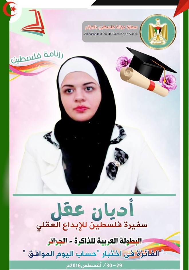 أقامت سفارة دولة فلسطين لدى الجزائر حفلا رمزيا لتكريم "رزنامة فلسطين"، وسفيرة فلسطين للإبداع العقلي الطالبة أديان عقل، حيث حضر الحفل مؤسس وممثلين عن البطولة العربية للذاكرة في الجزائر، وممثل البطولة في فلسطين، وعدد من كادر السفارة والجالية الفلسطينية في الجزائر.