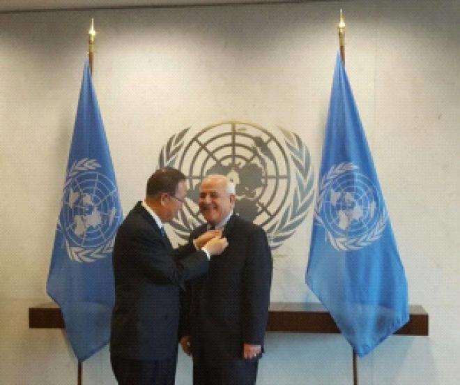 قلّد الأمين العام للأمم المتحدة، بان كي مون، المندوب الدائم لدولة فلسطين لدى الأمم المتحدة في نيويورك، السفير الدكتور رياض منصور، وسام "السفير العتيق"، بالإضافة إلى سبعة سفراء آخرين، تكريماً لعملهم كممثلين لبلدانهم في الأمم المتحدة لمدة 10 سنوات أو أكثر.