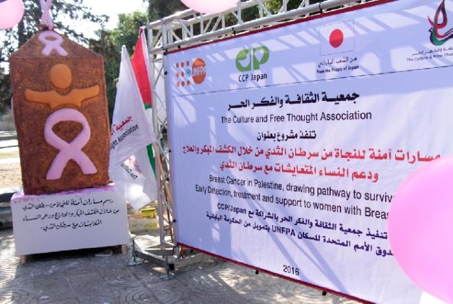دشن مركز صحة المرأة التابع لجمعية الثقافة والفكر الحر بالشراكة مع الحملة اليابانية من اجل اطفال فلسطين وصندوق الامم المتحدة للسكان ، وبتمويل من الحكومة اليابانية ، نصب تذكاري لتأييد ومساندة مريضات سرطان الثدي في ساحة الجندي المجهول وسط غزة .