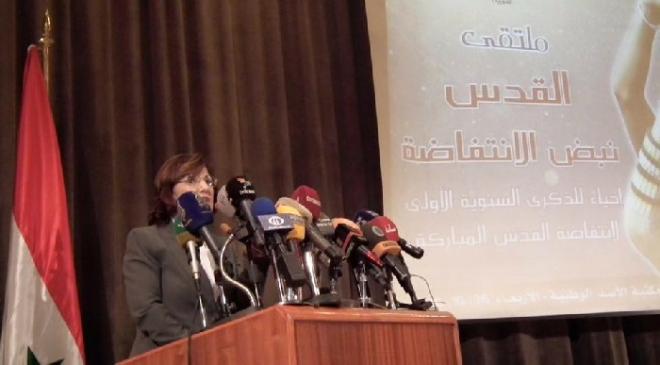 وقالت الدكتورة شعبان في كلمة لها ضمن فعاليات ملتقى "القدس نبض الانتفاضة" الذي تنظمه مؤسسة القدس الدولية فرع سورية إحياء للذكرى السنوية الأولى لانتفاضة القدس ، "إن الرئيس الراحل حافظ الأسد لم يحتج إلى 23 عاما ليقول إن اتفاق أوسلو لا قيمة له وانه لن ينفذ منه شيء وانه كارثة على الأمة العربية بل قالها مباشرة بعد الاتفاق .. ولا نحتاج اليوم إلى 23 عاما ولم يحتج الرئيس بشار الأسد إلى خمسة أو عشرة أعوام ليقول إن هذه الحرب على سورية ستحدد مستقبل العروبة ومستقبل العالم وهذا هو ما نراه جميعا أمامنا ".