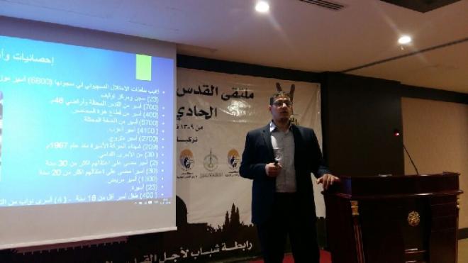 وقدم ممثل حملة تضامن في تركيا الإعلامي والباحث ماهر حجازي محاضرة تحت عنوان ( حال الأسرى إلى أين وكيف ننصرهم .. أسرى القدس نموذجا)، قدم من خلالها شرحا حول قضية الأسرى ونشأة الحركة الأسيرة الفلسطينية والتي تعود إلى مرحلة الاستعمار البريطاني لفلسطين.
