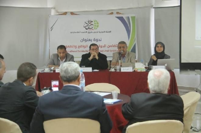 نظمت الهيئة الدولية لدعم حقوق الشعب الفلسطيني (حشد) اليوم ندوة بعنوان "التضامن الدولي بين الواقع والطموح"، وذلك في قاعة فندق آدم بمدينة غزة، بحضور أعضاء من الهيئة ومختصين وممثلي الأحزاب السياسية وناشطين في منظمات المجتمع المدني.