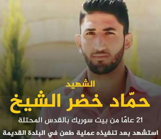 وأعلنت وزارة الصحة الفلسطينية، استشهاد الشاب حماد خضر الشيخ (٢١عامًا) من قرية بيت سوريك شمال غرب القدس ، برصاص جنود الاحتلال في شارع الواد في المدينة.