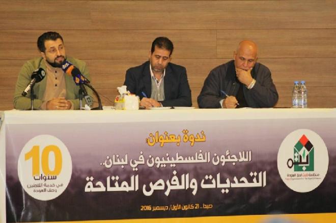 نظّمت منظمة "ثابت" لحق العودة ندوة بعنوان "اللاجئون الفلسطينيون في لبنان التحديات والفرص المتاحة"، في قاعة بلدية صيدا بمشاركة عدد من الباحثين الفلسطينيين المهتمين بقضية اللاجئين.