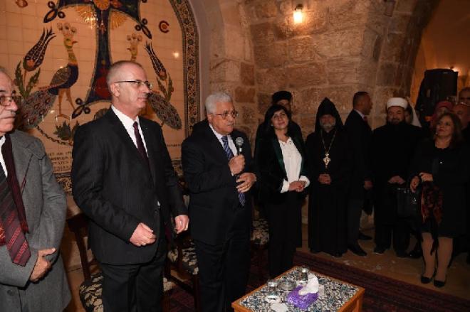 وكان في استقبال أبو مازن: رئيس الوزراء رامي الحمد الله، وعدد من الوزراء واعضاء المجلس التشريعي، ورؤساء بلديات بيت لحم وبيت ساحور وبيت جالا، وقادة الاجهزة الامنية وفعاليات المحافظة.