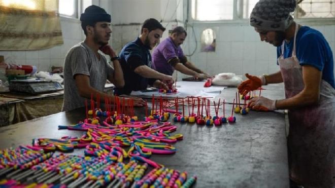وفي داخل ورشته الصغيرة في مدينة غزة، يُجهّز الخمسيني عجينة السكر، مُضيفاً إليها بعض الأصباغ المُلوّنة، كي يصنع منها لاحقاً قطعاً من الحلوى.