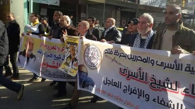 وطالب المعتصمون المؤسسات الدولية والمعنية بحقوق الإنسان بالتدخل الفوري للإفراج الفوري عن الأسير الشوبكي الذي يعاني من عدة أمراض مزمنة لكبر سنه .