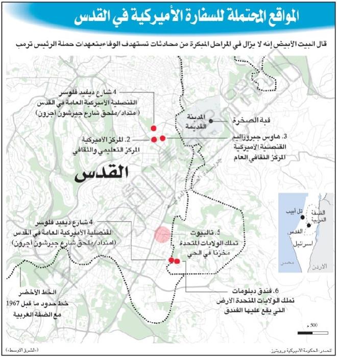 وعزز مقربون من ترمب الانطباع بأنه سيفعلها وينفذ وعده. وأجج مسؤولون إسرائيليون الأمر، مطلقين تصريحات مختلفة حول قناعتهم بتنفيذ ترمب خطوته؛ بل راح بعضهم، مثل رئيس بلدية القدس، نير بركات، يعلن أنه يجري مباحثات لوجيستية مع الأميركيين، من أجل تحديد طريقة نقل السفارة، ومكانها، وتوقيت ذلك. وهذا ما دفع الرئيس الفلسطيني إلى البعث برسالة مباشرة لترمب، قبل أن يلجأ إلى روسيا والأردن والسعودية ودول أخرى، من أجل الضغط على الرئيس الأميركي لوقف مخططه.