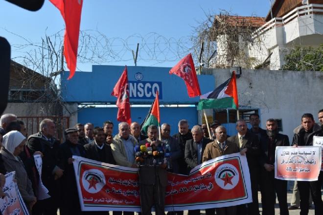 نظمت الجبهة الديمقراطية لتحرير فلسطين اليوم مسيرة جماهيرية حاشدة صوب مقر الأمم المتحدة في مدينة غزة، بمناسبة اليوم العالمي للتضامن مع الداخل الفلسطيني المحتل عام 48 والذي يصادف اليوم الثلاثين من يناير، بمشاركة حشد واسع من جماهير شعبنا وقيادة وكوادر الجبهة، وممثلي القوى الوطنية والإسلامية، وشخصيات وطنية ونقابية، وقطاعات نسوية وشبابية ومهنية، حاملين الأعلام الفلسطينية وشعارات وهتافات تدين العنصرية الإسرائيلية وسياسة هدم المنازل وتحيي صمود أهلنا في الـ48.