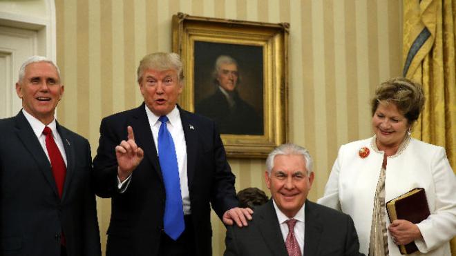 ومن جانبه اكد تيلرسون  خلال المراسم التي اقيمت في البيت الابيض الليلة الماضية انه "يضع اولا ودوما المصالح الامريكية نصب عينيه."