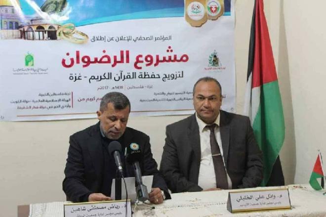 أطلقت جمعية التيسير للزواج والتنمية بالتعاون مع جمعية الرياض الخيرية للتنمية المجتمعية مشروع الرضوان لتزويج حفظة القرآن الكريم في قطاع غزة.
